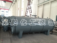 具有结构简单,操作方便,使用周期长,性能稳定可靠,蒸汽耗量小,适用性能强,产品质量好,特别适用于不耐高温、易燃、调温下易氧化的膏状物料的干燥,该机经用户长期使用证明是一良好的干燥设备。原理:被干燥物料从壳体上方正中间加入,在不断正反转动的耙齿的搅拌下,物料轴向来回走动,与壳体内壁接触的表面不断更新,受到蒸汽的间接加热,耙齿的均匀搅拌,粉碎棒的粉碎,使物料表面水分更有利的排出,气化的水分经干式除尘器、湿式除尘器、冷凝器,从真空泵出口处放空。